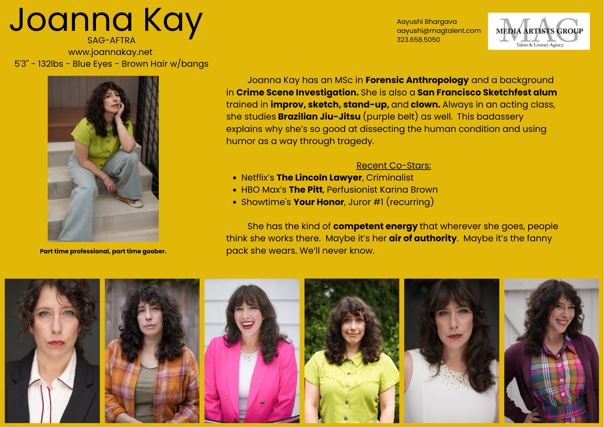 With a background in Crime Scene Investigation and Forensic Anthropology, Joanna has always been interested in exploring the human condition, but now she does so through the arts. In addition to acting, her passions include snacks, comedy, and dogs. She assists in an acting class comprised of amazing performers with special needs called Born to Act Players (a 501c3 if you're looking to support a great group!). Recent credits include Your Honor, Lincoln Lawyer, and The Pitt. If you'd like to connect, you can find her at www.joannakay.net. Joanna wrote this bio in 3rd person.